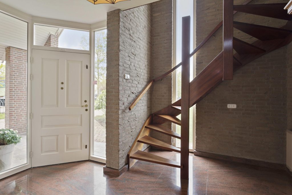 U betreedt de woning via een representatieve hal met een indrukwekkende wenteltrap en een prachtige natuurstenen vloer.