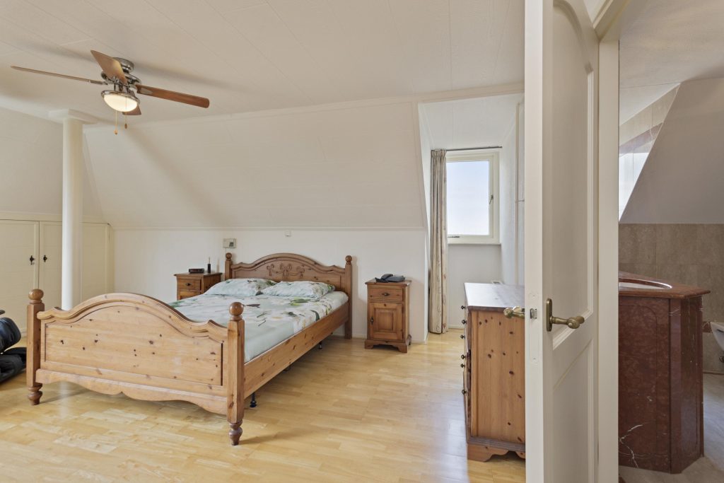 De verdieping telt vier ruime slaapkamers, waarbij de masterbedroom over een luxe ensuite badkamer beschikt. Drie kamers geven directe toegang tot het beschutte balkon. Beide badkamers zijn afgewerkt met hoogwaardig natuursteen voor een tijdloze uitstraling. Via een vaste trap bereikt u de riante zolder. Deze lichte ruimte is perfect bruikbaar als extra werkruimte, atelier of hobbykamer.