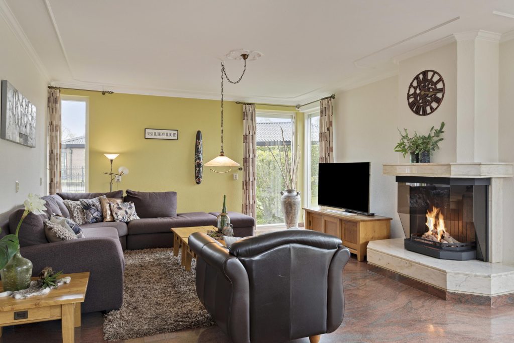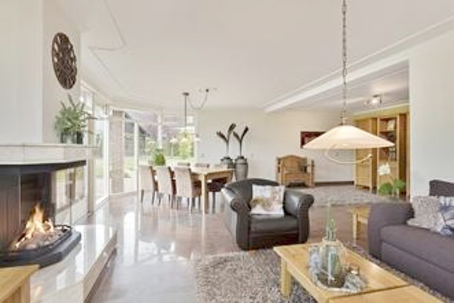 De royale woonkamer is volledig gericht op de tuin. Dankzij de kamerhoge raampartijen en openslaande deuren geniet u hier van een maximale lichtinval. De geïntegreerde gashaard vormt een sfeervol middelpunt in deze lichte ruimte.